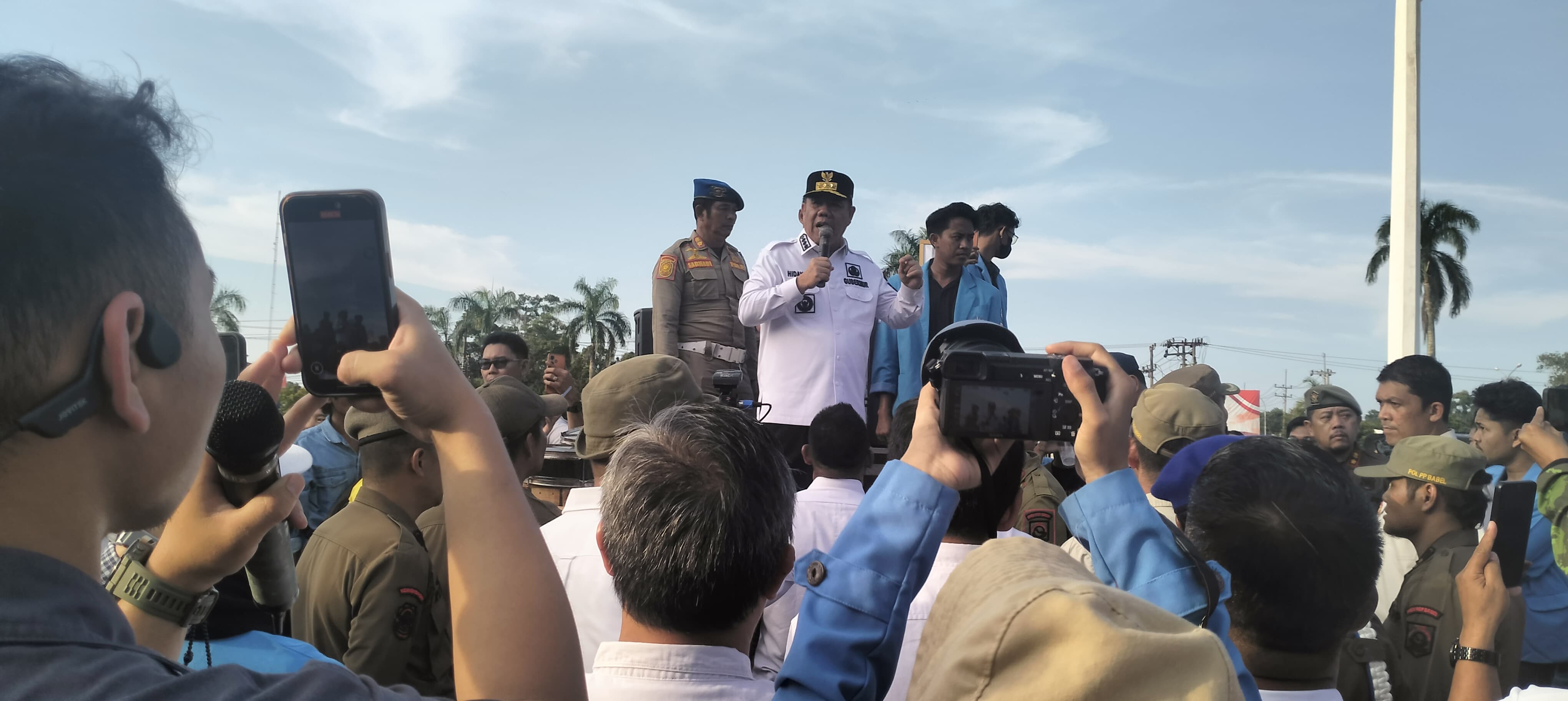 PANGKALPINANG – Gubernur Kepulauan Bangka Belitung (Babel) Hidayat Arsani, mendengarkan aspirasi yang disampaikan ratusan Mahasiswa Universitas Bangka Belitung (UBB) dalam aksi damai di Halaman Kantor Gubernur, Rabu (07/05/2025).
