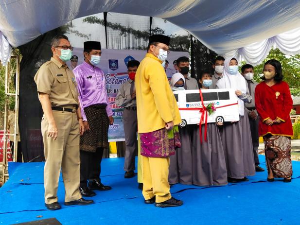 Gubernur Kepulauan Bangka Belitung, Erzaldi Rosman didampingi Kepala Dinas Pendidikan Babel dan Kepala Cabang Dinas Pendidikan Wilayah Bangka Barat melakukan penyerahan secara simbolis kunci mobil jenis minibus kepada SLB Muntok, (8/7/2021)