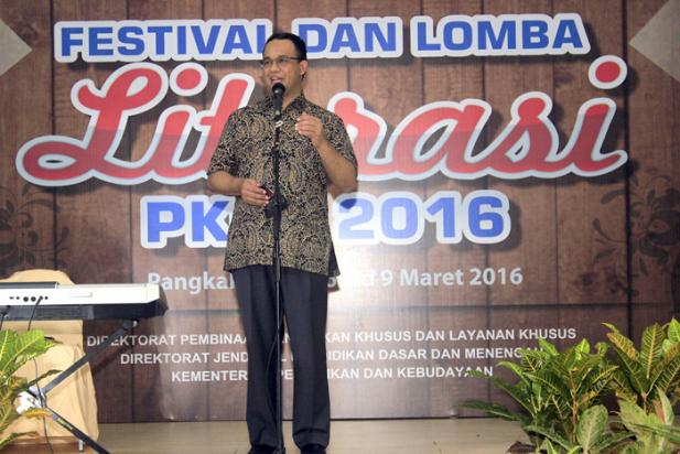Pangkalpinang -- Menteri Pendidikan dan Kebudayaan, Anies Bawesdan Penutupan Festival dan Lomba Literasi Pendidikan Khusus dan Layanan Khusus (PKLK) bertempat di Ruang Serba Guna LPMP Pangkalpinang, Bangka Belitung, Rabu malam (8/3/2016). Acara berlangsung selama tiga hari ini (6 s.d 8 Maret) diselenggarakan oleh Kementerian Pendidikan dan Kebudayaan melalui Direktorat Jenderal Pendidikan Dasar dan Menengah, diikuti oleh 238 orang (berasal dari 34 provinsi) yang terdiri atas 102 peserta, 102 orang pendamping, dan 34 pembina.