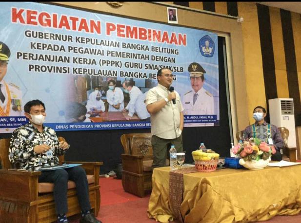 Pangkalpinang, Gubernur Babel, Erzaldi Rosman melakukan pembinaan kepada 490 Calon Pegawai Pemerintah dengan Perjanjian Kinerja (P3K) Guru SMA/SMK/SLB se-Babel melalui tatap muka dan virtual, di Ruang Pertemuan Hotel Granvella, Kamis(27/01/2022).
