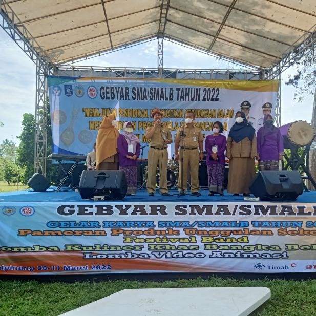 Pangkalpinang, Dinas Pendidikan Provinsi Kepulauan Bangka Belitung melalui Program Kerja Musyawarah Kerja Kepala Sekolah SMA/SMALB Provinsi Kepulauan Bangka Belitung resmi menggelar Gebyar SMA/SMALB Tahun 2022 yang dibuka oleh Tarian Pinang Sebelas yang merupakan kolaborasi siswi-siswi dari 14 SMA Babel dan Tari Kreasi Muda Mudi Merdeka SMA N 3 Pangkalpinang.