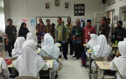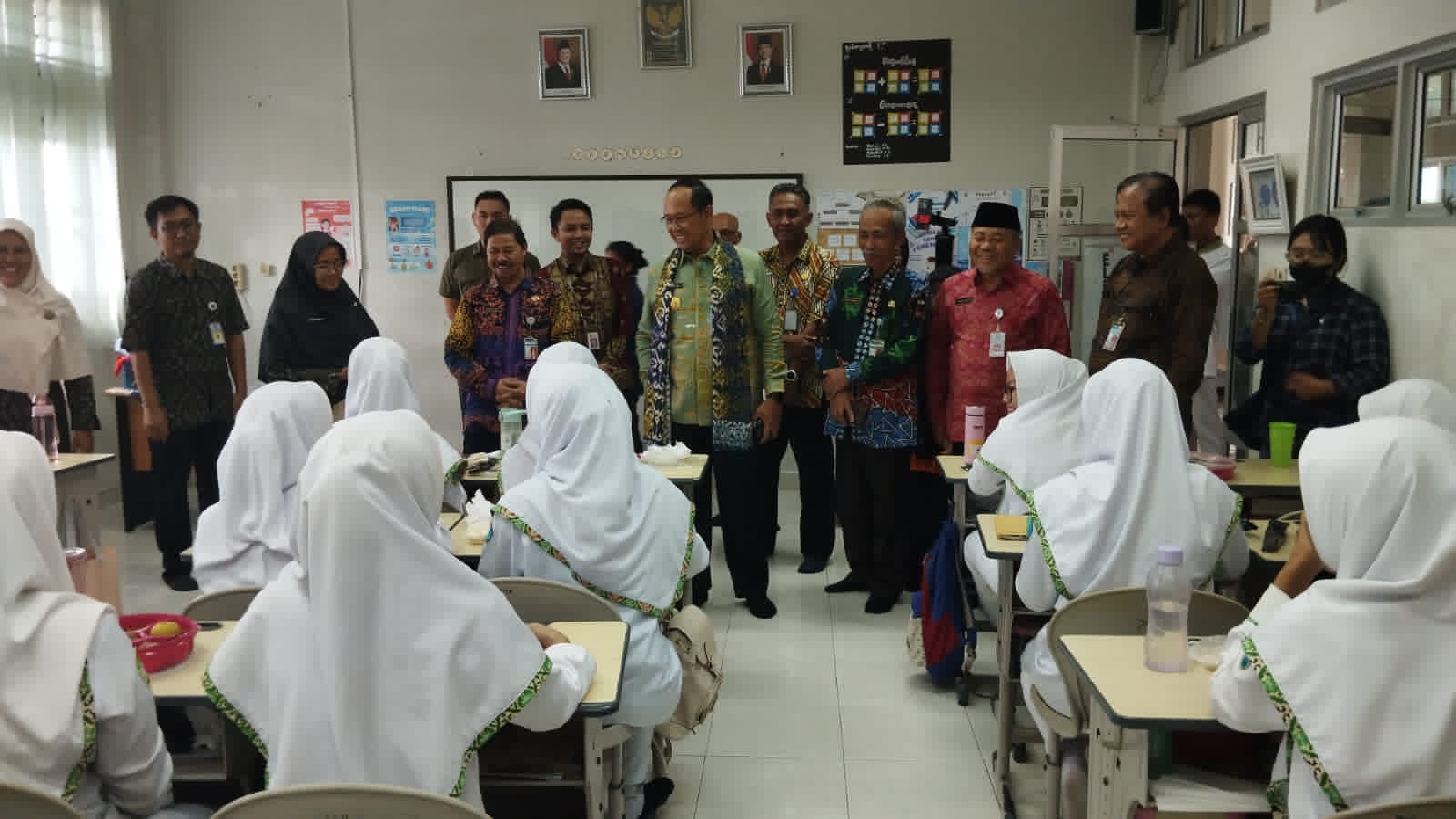 Sugito, Pj Gubernur Bangka Belitung meninjau uji coba pemberian makan siang bergizi gratis kepada siswa SMK N 5 Pangkalpinang, yakni 260 siswa-siswi kelas 10 dan kelas 11 sebanyak 8 kelas, Kamis, (12/12/2029) di SMK N 5 Pangkalpinang.