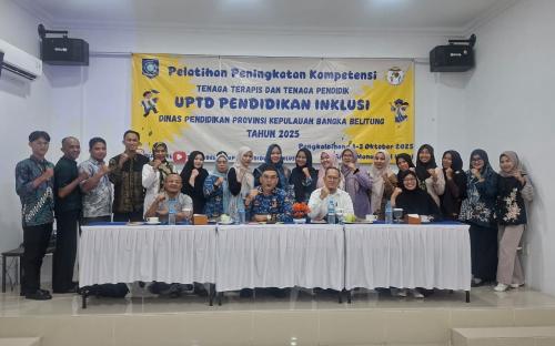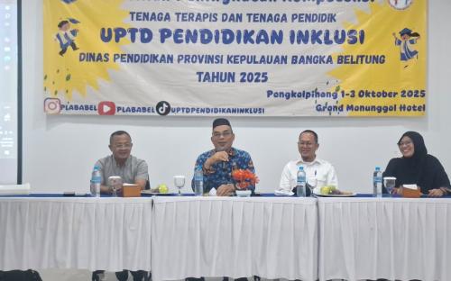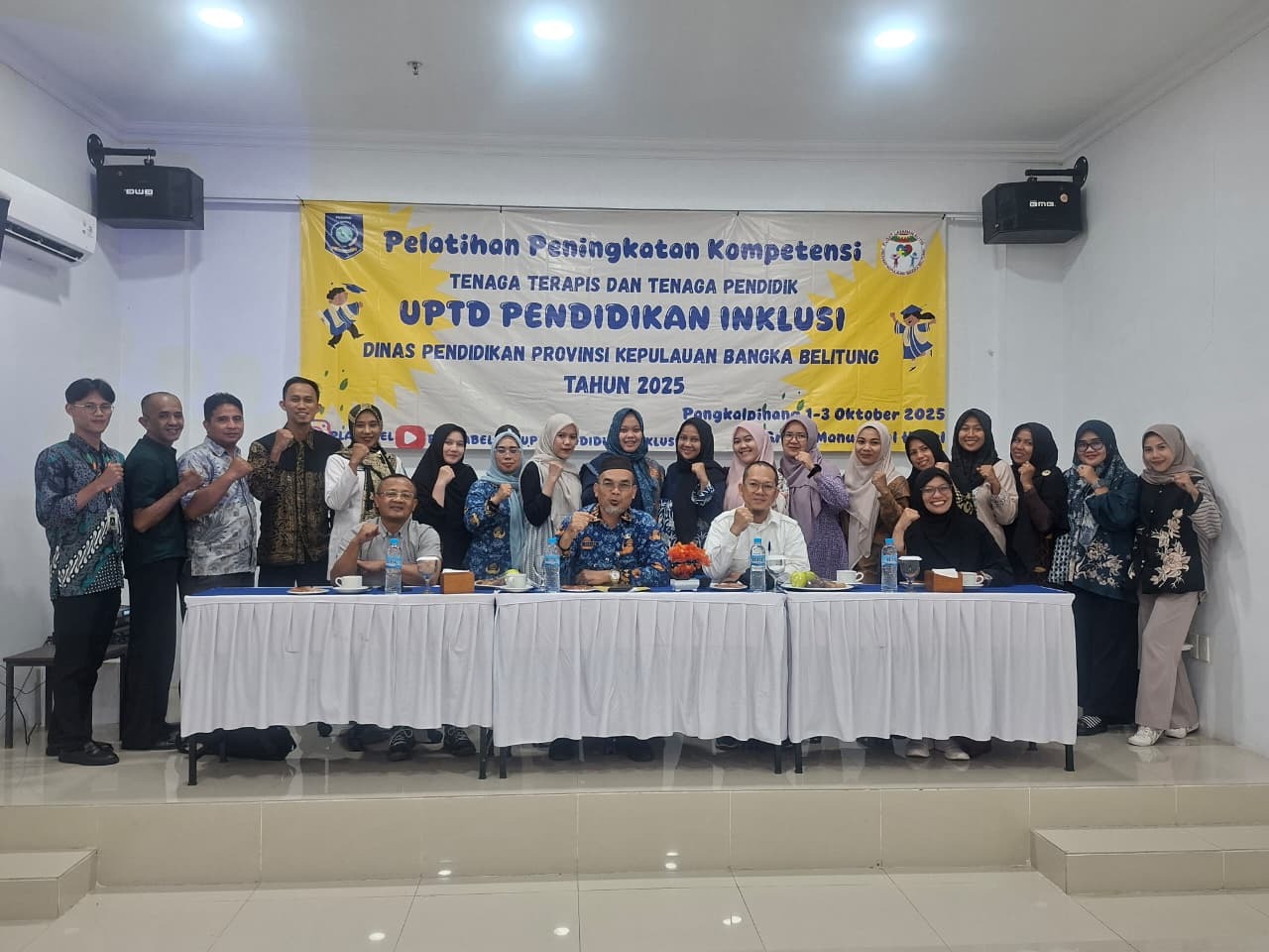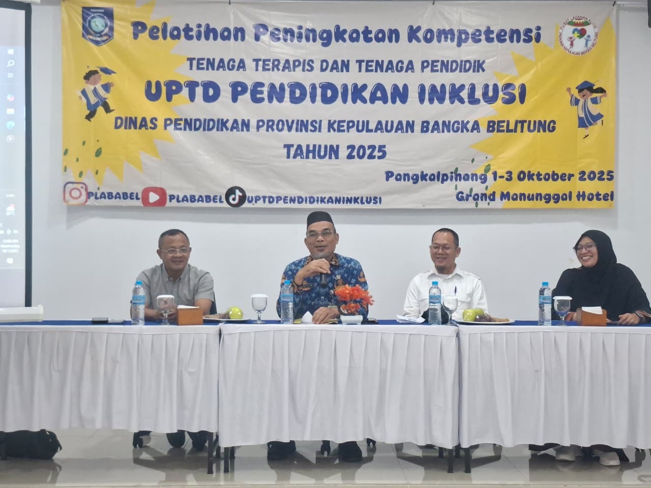 Plt. Kepala Dinas Pendidikan Provinsi Kepulauan Bangka Belitung, Darlan, membuka secara resmi Pelatihan Peningkatan Kompetensi Tenaga Terapis dan Tenaga Pendidik UPTD Pendidikan Inklusi, di Ruang Pertemuan Hotel Grand Manunggal Pangkalpinang, Rabu (1/10/2025), dihadiri oleh 14 orang terapis (2 orang Terapi Wicara, 4 orang Terapi Perilaku, 5 orang Terapi Sensori Integras, dan 3 orang Tenaga Pendidik Transisi).