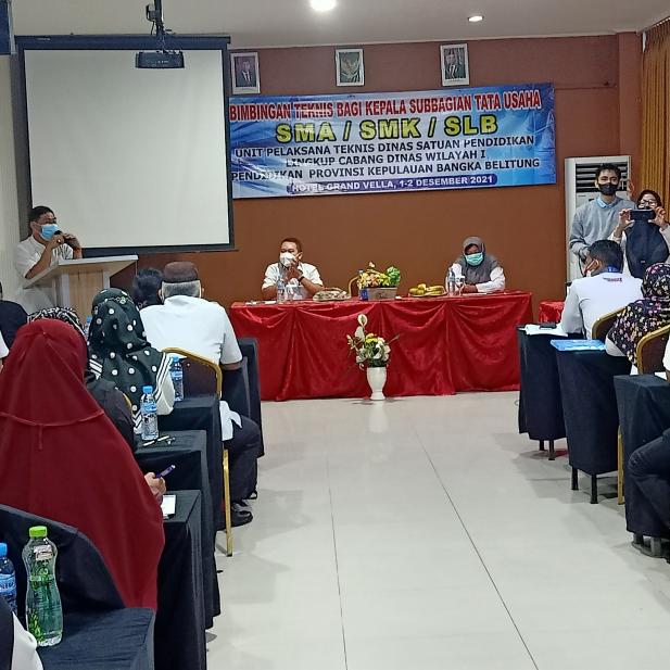 UPT. Dinas Satuan Pendidikan lingkup Cabdin Wilayah I Pendidikan Prov.Kep.Babel menggelar Bimbingan Teknis Tata Usaha SMA dan SLB selama 2 hari dimulai tanggal 1 Desember 2021 s.d 2 Desember 2021, di Grandvella Hotel, Pangkalanbaru, Koba.Senin (1/12/2021).