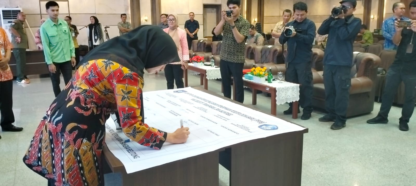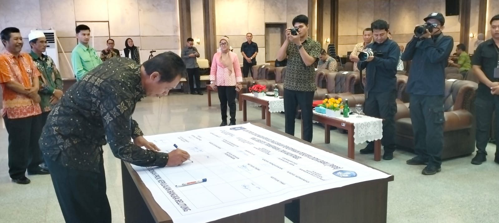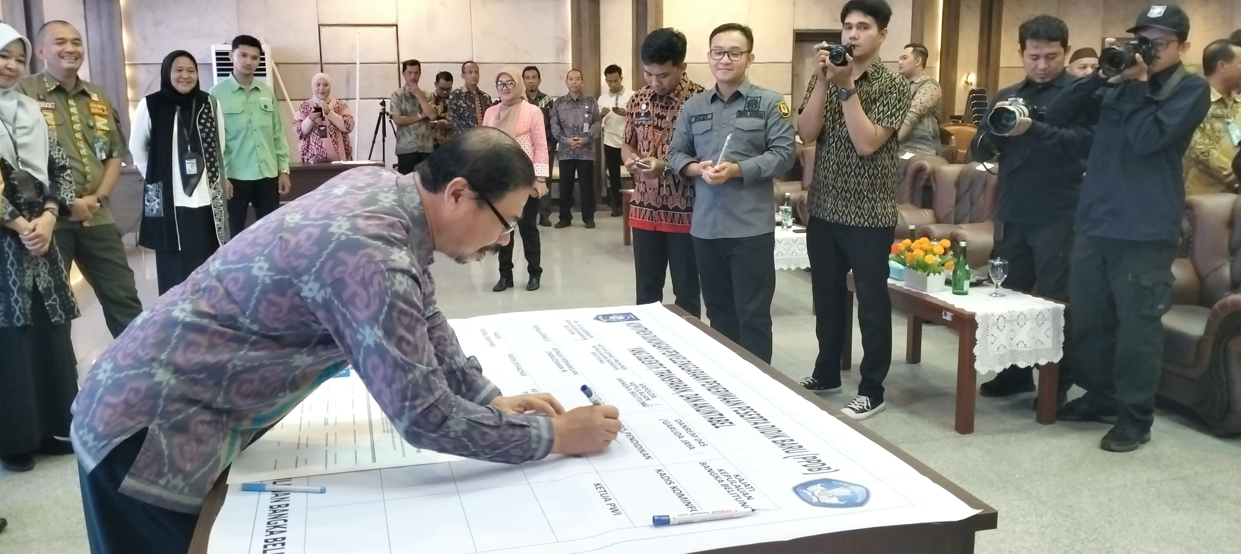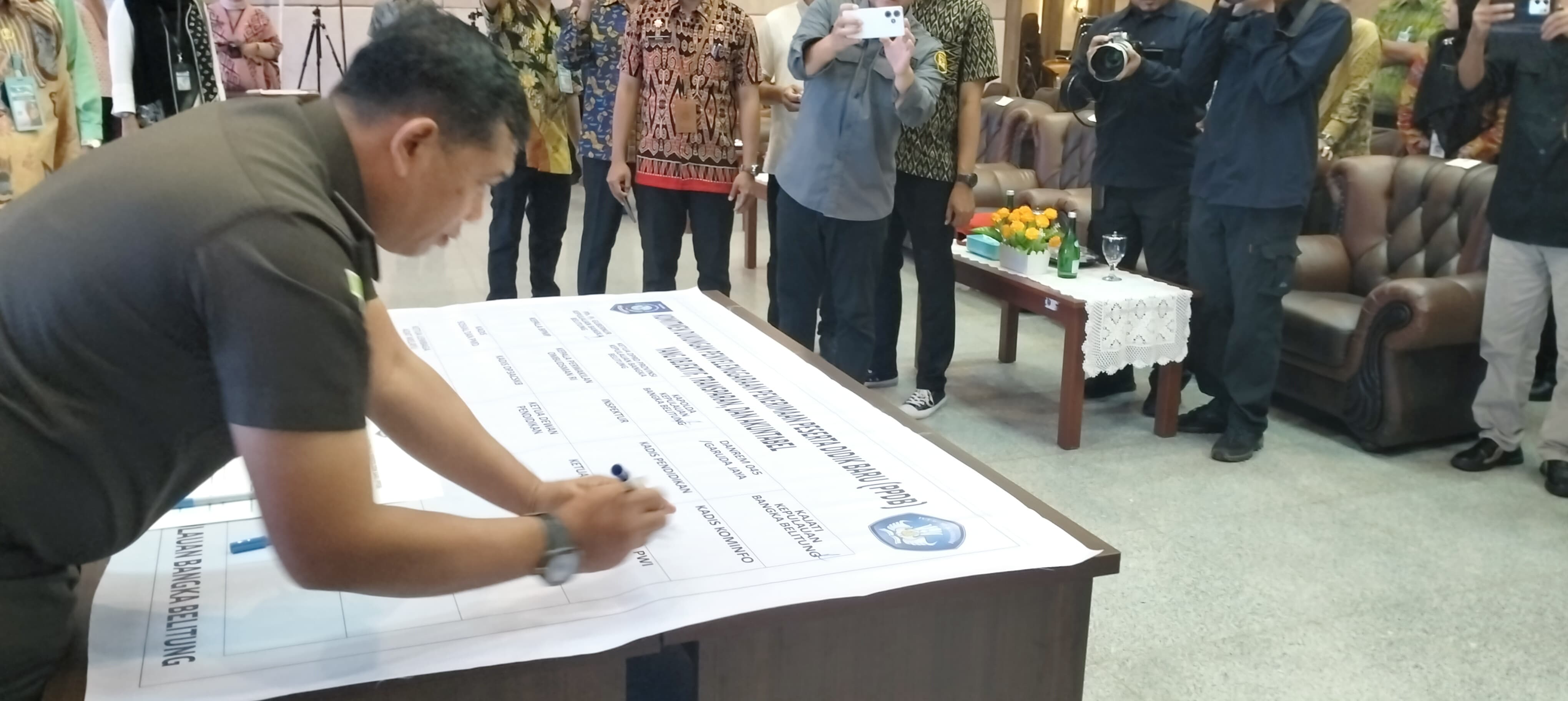 Hadir dan turut menandatangani Komitmen Dukungan Penyelenggaraan Penerimaan Peserta Didik Baru (PPDB) Tahun 2024 ini Asisten III Bidang Administrasi Umum Sekretariat Daerah Pemerintah Provinsi Kepulauan Bangka Belitung, Perwakilan Anggota Forum Koordinasi Pimpinan Daerah Provinsi Kepulauan Bangka Belitung (Kejaksaan Tinggi Prov.Kep.Babel, Kapolda Babel, Danrem 04 Babel), Perwakilan Ombudsman Prov. Babel, Kepala Dinas Pendidikan Prov. Kep. Babel, Ketua PGRI Babel, Ketua Musyawarah Kerja Kepala Sekolah (MKKS) SMA Babel, Perwakilan Musyawarah Kerja Pengawas Sekolah SMA/SMK Babel, Ketua Dewan Pendidikan Prov. Kep. Babel, Perwakilan Perangkat Daerah Prov. Kep. Babel ( BPMP Prov. Kep. Babel, DP3ACSKB Prov. Kep. Babel, Dinsos Prov Kep Babel), Sekretaris Dinas Pendidikan Prov.Kep. Babel, Kepala Bidang SMK Dinas Pendidikan Prov.Kep. Babel, Plh, Kepala Bidang SMA Dinas Pendidikan Prov.Kep. Babel, Kepala Bidang Guru dan Tenaga Kependidikan Dinas Pendidikan Prov.Kep. Babel, Plh. Kepala Bidang Pendidikan Khusus Dinas Pendidikan Prov.Kep. Babel, Kepala Balai Teknologi Informasi Komunikasi Pendidikan (BTIKP) Dinas Pendidikan Prov. Kep. Babel, Kepala Cabang Dinas Pendidikan Wilayah I, Perwakilan Kepala Cabang Dinas Pendidikan Wilayah II, Kepala Cabang Dinas Pendidikan Wilayah III, Kepala Cabang Dinas Pendidikan Wilayah IV, dan Kepala Cabang Dinas Pendidikan Wilayah V.