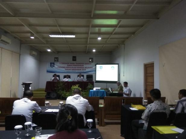 PANGKALPINANG – Dinas Pendidikan Provinsi Kepulauan Bangka Belitung melalui Subag Perencanaan, melaksanakan Workshop Dana Transfer Daerah Tahun 2018. Kegiatan ini dilakukan selama 3 (tiga) hari dimulai tanggal 31 Oktober s.d 2 November 2018 bertempat di Bangka City Hotel Pangkalpinang.