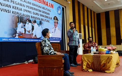 Pangkalpinang, Gubernur Babel, Erzaldi Rosman melakukan pembinaan kepada 490 Calon Pegawai Pemerintah dengan Perjanjian Kinerja (P3K) Guru SMA/SMK/SLB se-Babel melalui tatap muka dan virtual, di Ruang Pertemuan Hotel Granvella, Kamis(27/01/2022).