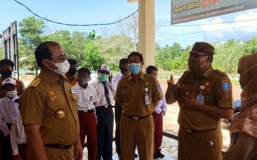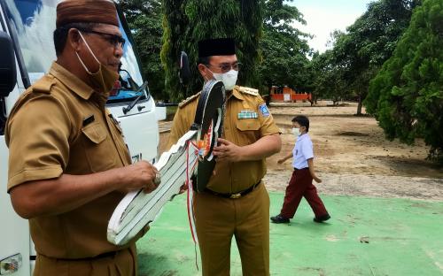Bus sekolah diserahkan langsung Gubernur Kepulauan Bangka Belitung, Erzaldi Rosman yang ditandai dengan penyerahan simbolis kunci Bus kepada Kepala Sekolah Luar Biasa Negeri Toboali, Alfian, di Halaman SLB N Toboali, Selasa (6/11/2021).