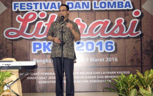 Pangkalpinang -- Menteri Pendidikan dan Kebudayaan, Anies Bawesdan Penutupan Festival dan Lomba Literasi Pendidikan Khusus dan Layanan Khusus (PKLK) bertempat di Ruang Serba Guna LPMP Pangkalpinang, Bangka Belitung, Rabu malam (8/3/2016). Acara berlangsung selama tiga hari ini (6 s.d 8 Maret) diselenggarakan oleh Kementerian Pendidikan dan Kebudayaan melalui Direktorat Jenderal Pendidikan Dasar dan Menengah, diikuti oleh 238 orang (berasal dari 34 provinsi) yang terdiri atas 102 peserta, 102 orang pendamping, dan 34 pembina.