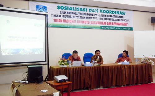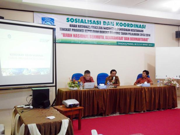 Pelaksanaan sosialisasi ujian nasional dan ujian sekolah tingkat Provinsi Kepulauan Bangka Belitung Tahun Pelajaran 2013/2014 dilaksanakan selama 2 (dua) hari dari tanggal 3 - 4 Maret 2014 bertempat di Hotel Aksi, Kota Pangkalpinang dan dihadiri oleh Dinas Pendidikan dan Kantor Kementerian Agama Kota/Kabupaten se Provinsi Kepulauan Bangka Belitung.