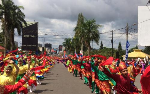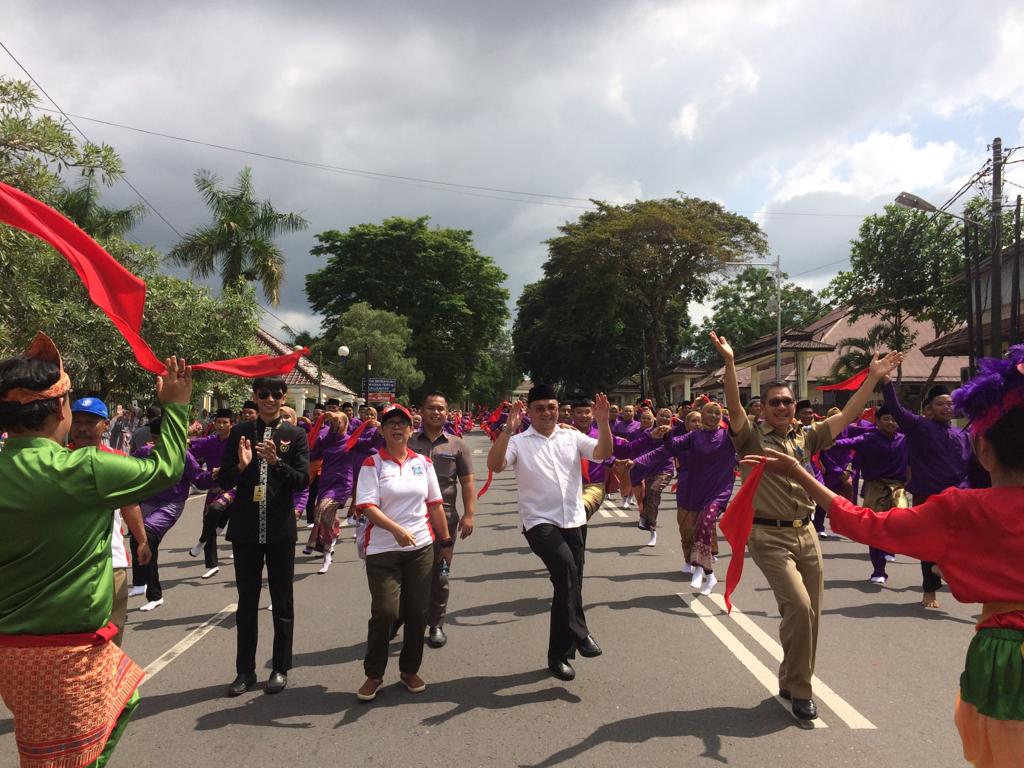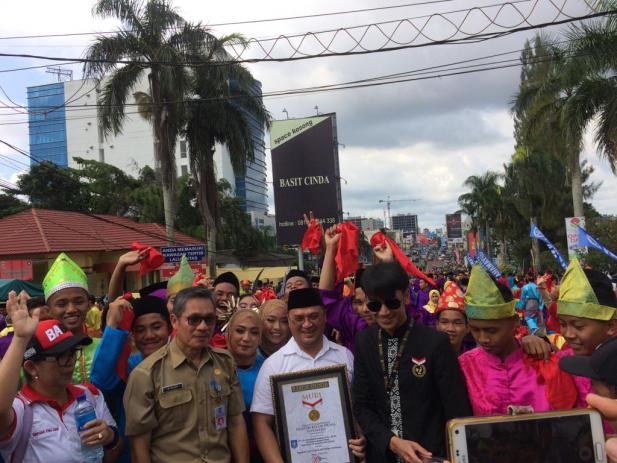 PANGKALPINANG--Pergelaran Tarian Campak Kolosal oleh 1854 Pelajar SMA/SMK se-Babel, Selasa (30/4/2019) yang berlangsung di Jalan Jenderal Sudirman Pangkalpinang mendapat Rekor Muri Dunia. Ribuan pelajar dengan kostum yang berwarna - warni memberikan keindahan dan kekaguman dari masyarakat yang menonton, termasuk Gubernur Kepulauan Bangka Belitung, Erzaldi Rosman. Bahkan Gubernur turut berlenggak- lenggok, menari dalam alunan musik yang mengalun.