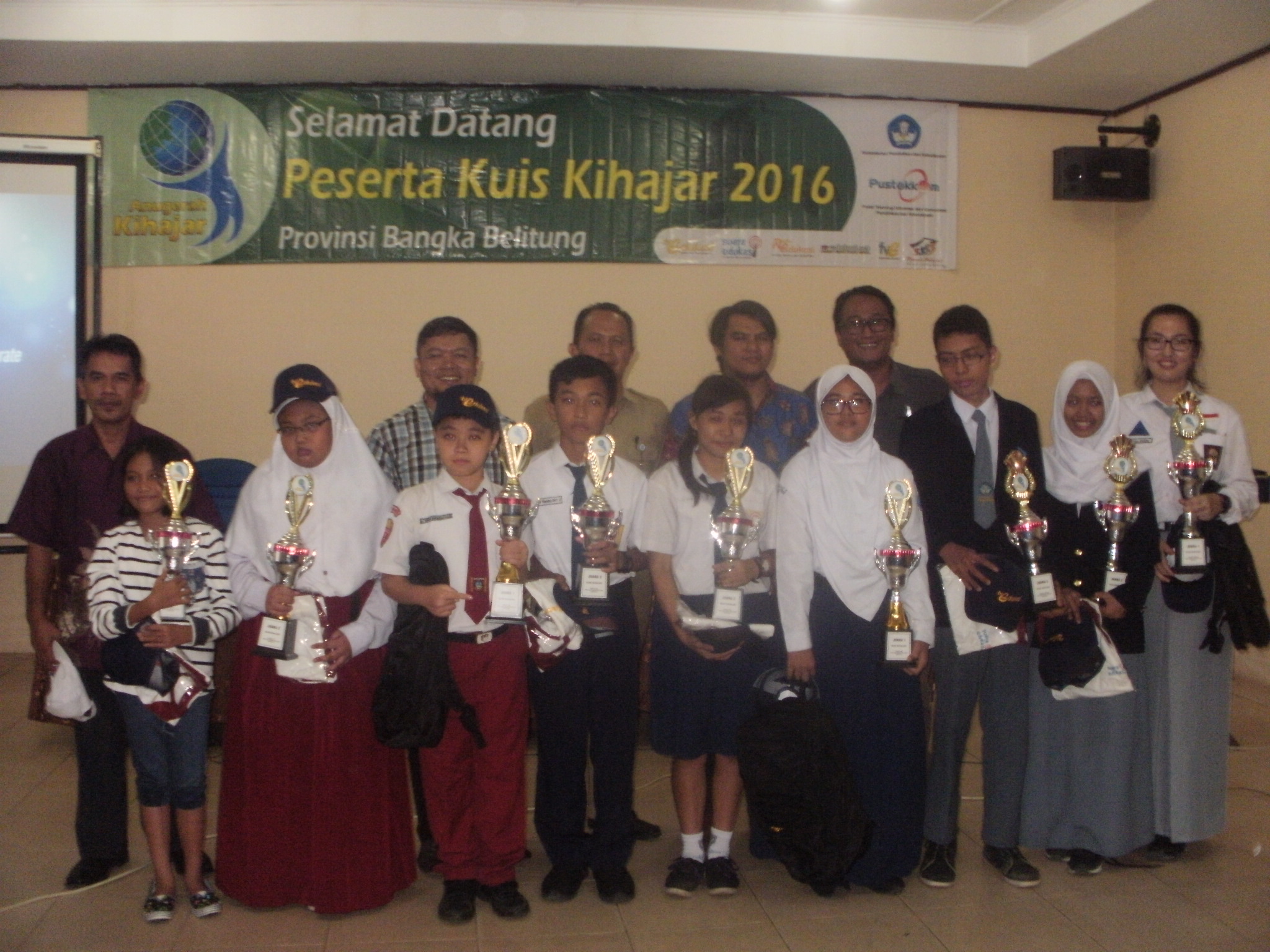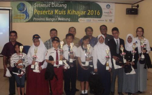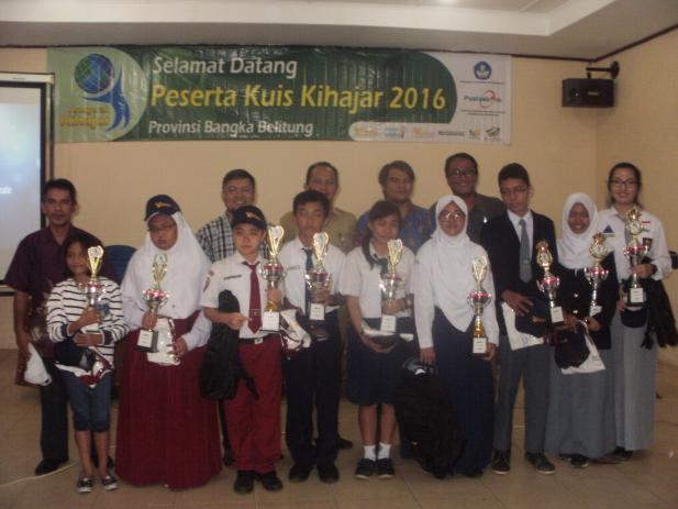 PANGKALPINANG-Penutupan Lomba Kuis Kihajar Tingkat Provinsi Tahun 2016 yang diselenggarakan di Hotel Aksi Natural Resort, Pangkalpinang, (4/10) yang diikuti sebanyak 81 Siswa dari Tingkat SD, SMP, SMA akhirnya berhasil diperebutkan oleh 3 orang pemenang dari masing-masing tingkat diantaranya Juara 1 Tingkat SD dimenangkan oleh M. Thoriq Ramadhan Rizki dari SD Negeri 10 Pangkalpinang, Kota Pangkalpinang, Juara 1 Tingkat SMP dimenangkan oleh Farras Audia Raihany dari SMP Negeri 1 Pangkalpinang, Kota Pangkalpinang. Dan Juara 1 Tingkat SMA dimenangkan oleh Anastasia Joanne dari SMA Negeri 1 Sungailiat, Kabupaten Bangka. Ketiga pemenang ini diperoleh hasil seleksi akhir dari 9 finalis yang mendapatkan Juara I,II, dan III.