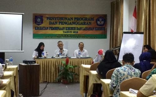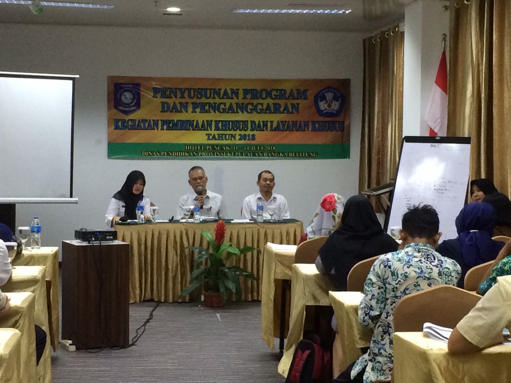 Workshop penyusunan program dan peanggaran Pendidikan Khusus dan Layanan Khusus (PKLK) yang dilaksanakan di Hotel Puncak Pangkalpinang selama 4 (empat) hari, mengundang Bendahara/Tata Usaha SLB se-Provinsi Kepulauan Bangka Belitung sebanyak 22 orang, dan dihadiri oleh pejabat eselon 3 dan 4 Dinas Pendidikan Prov. Kep. Bangka Belitung, Pejabat Kantor Bappeda, dan Pejabat Cabang Dinas Sekolah.